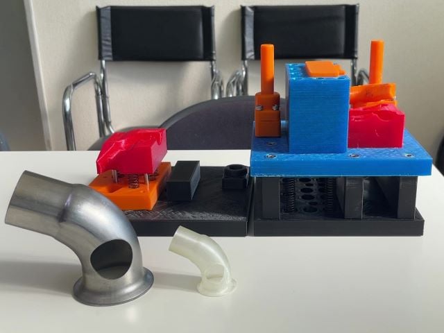 油圧の専用機械を使用してパイプの拡管を行うのではなく、プレス機を使用してパイプの拡管加工ができるように金型を製作しました。