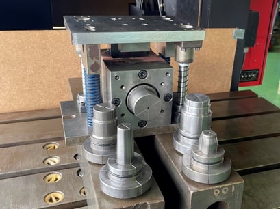 この金型の特徴は、独自の調整機構を持っており金型の一部を調整することでプレス機のダイハイトを変えずに寸法の微調整が可能です。油圧プレスでも同じ寸法で繰り返し加工を行うことが大きなメリットです。