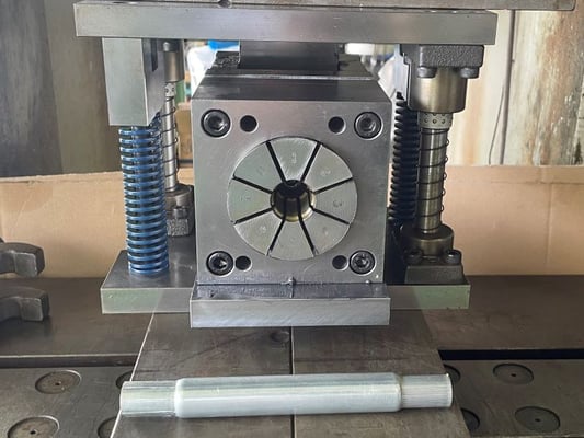加工内容によっては加工能力が10トン程度のプレス機で加工を行うことが可能です。GIF画像の金型は、加工能力が10トンの油圧プレス用に製作したタタキ型タイプの縮管加工金型です。